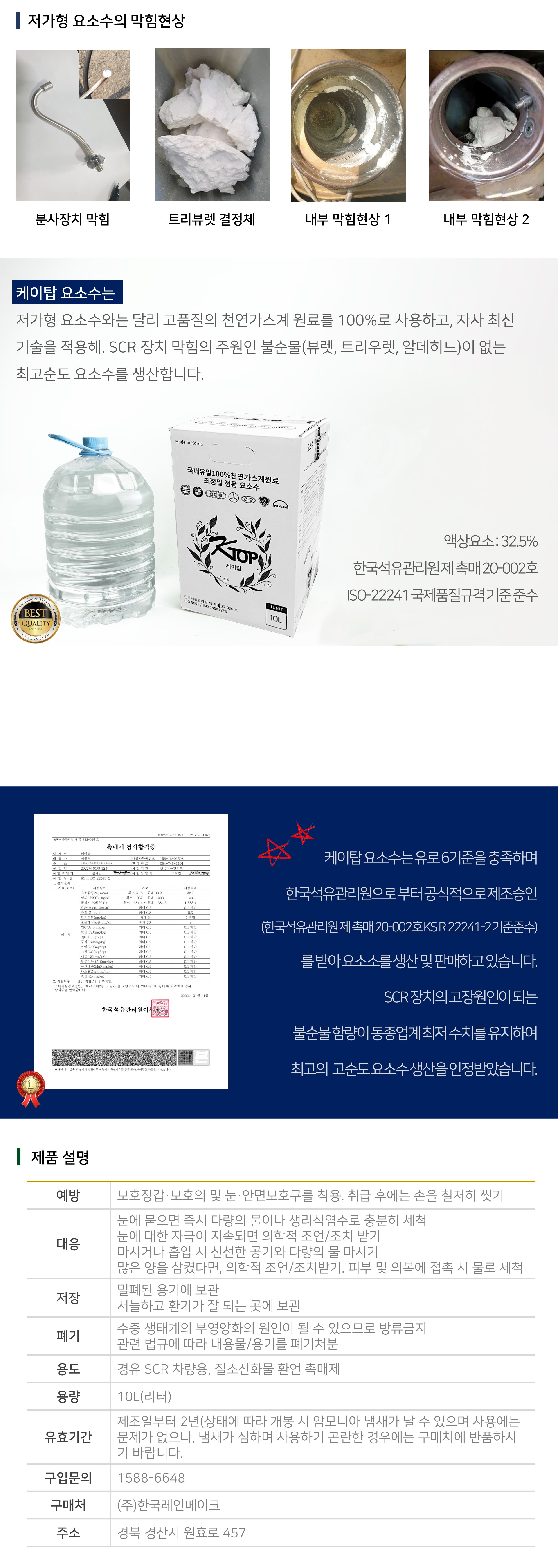 KTOP 국내산 디젤 차량용 요소수 10L - 1 파레트(100개)